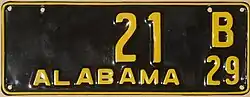 1928–29 | Embossed yellow serial on black plate with border line; "ALABAMA" at bottom, offset to left; "29" at bottom right | none | 123-456A | Coded by horsepower class (A) | |