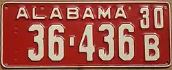 1929–30 | Embossed white serial on red plate with border line; "ALABAMA" at top, offset to left; "30" at top right | none | 123-456A | Coded by horsepower class (A) | |