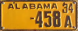 1933–34 | Embossed black serial on orange plate with border line; "ALABAMA" at top, offset to left; "34" at top right | none | 123-456A | Coded by weight class (A) | |