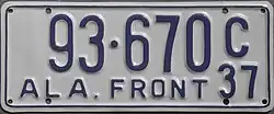 1936–37 | Embossed blue serial on white plate with border line; "ALA. FRONT" (on front plates) or "ALABAMA" (on rear plates) at bottom, offset to left; "37" at bottom right | none | 123-456A | Coded by weight class (A) | Separate front and rear plates. |