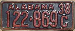 1937–38 | Embossed red serial on dark blue plate with border line; "ALABAMA" at top, offset to left; "38" at top right | none | 123-456A | Coded by weight class (A) | |