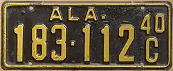 1939–40 | Embossed yellow serial on black plate with border line; "ALA." at top, offset to left; "40" at top right | none | 123-456A | Coded by weight class (A) | |