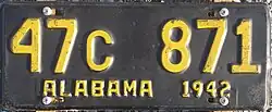 1941–43 | Embossed yellow serial on black plate; "ALABAMA 1942" centered at bottom | none | 1A12·345 10A1·234 |