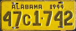 1943–44 | Embossed black serial on yellow plate; "ALABAMA 1944" centered at top | none | 1A12·345 10A1·234 |