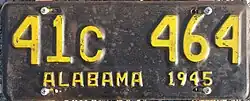 1944–45 | Embossed yellow serial on black plate; "ALABAMA 1945" centered at bottom | none | 1A12·345 10A1·234 |