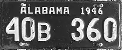 1945–46 | Embossed white serial on black plate; "ALABAMA 1946" centered at top | none | 1A12·345 10A1·234 |