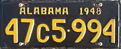 1947–48 | Embossed golden yellow serial on black plate; "ALABAMA 1948" centered at top | none | 1A12·345 10A1·234 |