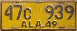 1948–49 | Embossed black serial on golden yellow plate with border line; "ALA. 49" centered at bottom | none | 1A12·345 10A1·234 |