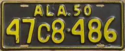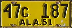 1950–51 | Embossed black serial on yellow plate with border line; "ALA. 51" centered at bottom | none | 1A12·345 10A1·234 |