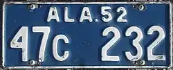 1951–52 | Embossed white serial on blue plate with border line; "ALA. 52" centered at top | none | 1A12·345 10A1·234 |