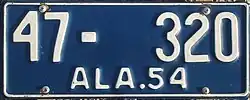 1953–54 | Embossed white serial on blue plate with border line; "ALA. 54" centered at bottom | none | 1-123·456 10-12·345 |