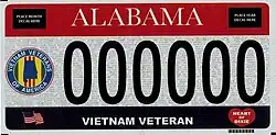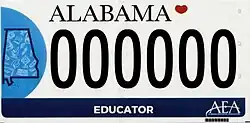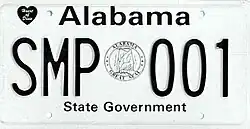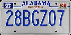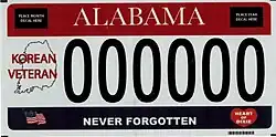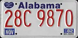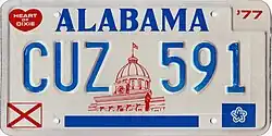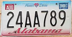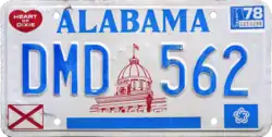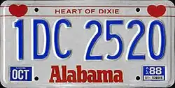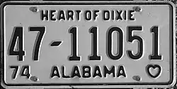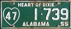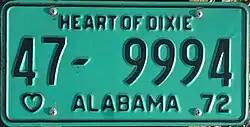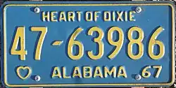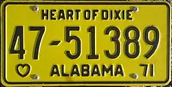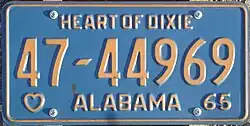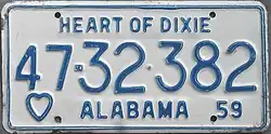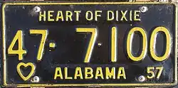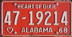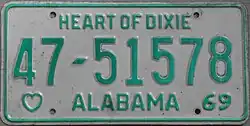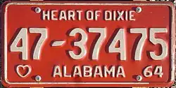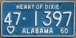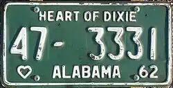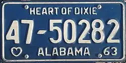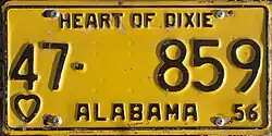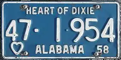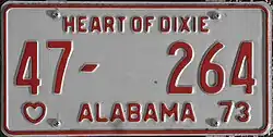 A 1951 law added a heart shape and the phrase "Heart of Dixie" to the state's license plates (beginning with the 1954–55 plate), adopting a slogan created by the Alabama Chamber of Commerce. The heart motif and slogan remain in use on all standard-issue plates today.[1]
