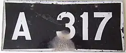 Anguilla requires its residents to register their motor vehicles and display vehicle registration plates.[1] Current plates, changed in 2007, have a blue and white background with black letters and are North American standard 6 by 12 inches (152 mm × 300 mm). Vehicle plates have an 'A' followed by four digits.[1] The letter denoting the type of vehicle has been moved to the front and 'P' is now designated for personal vehicles.[2]