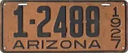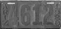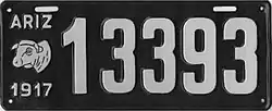 1917 | Embossed white serial on black plate; embossed steer head graphic at left with "ARIZ" above and "1917" below | none | 12345 | 1 to approximately 20000 | |