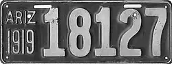 1919 | Embossed white serial on black plate with border line; "ARIZ 1919" at left | none | 12345 | 1 to approximately 29000 | |