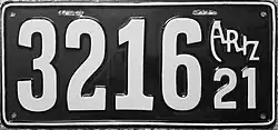 1921 | Embossed white serial on black plate with border line; stylized "ARIZ" and "21" at right | none | 12345 | 1 to approximately 36000 | |