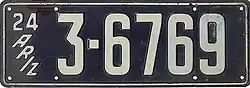 1924 | Embossed white serial on dark blue plate with border line; "24" and stylized vertical "ARIZ" at left | none | 1-12345 10-1234 |