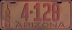 1928 | Embossed red serial on copper plate with border line; "ARIZONA" at bottom, offset to right; vertical "1928" at left | none | 1-12345 10-1234 |