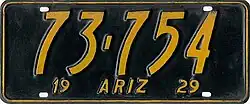 1929 | Embossed slanted orange serial on black plate with border line; slanted "19 ARIZ 29" centered at bottom | none | 123-456 | Issued in blocks by county | |