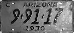 1930 | Embossed slanted black serial on white plate; slanted "ARIZONA" and "1930" centered at top and bottom respectively; letter at top left denoting county of issuance | none | 12-34-56 | Issued in blocks by county | |