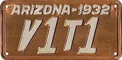 1932 | Embossed slanted white serial on copper plate; slanted "ARIZONA-1932" at top | none | 1AB1 1A1B AA12 A1A2 |