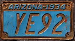 1934 | Debossed slanted copper serial within embossed light blue rectangle on copper plate; slanted "ARIZONA-1934" at top | none | 1AB1 1A1B AA12 A1A2 |