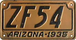 1935 | Embossed slanted black serial within black rectangular outline on copper plate; slanted "ARIZONA-1935" at bottom | none | 1AB1 1A1B AA12 A1A2 |