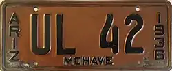 1936 | Embossed black serial on copper plate; vertical "ARIZ" and "1936" at left and right respectively; county name centered at bottom | none | 1A B1 1A 1B AA 12 A1 A2 |