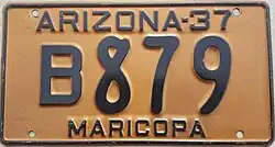 1937 | Embossed black serial on copper plate with border line; "ARIZONA-37" and county name centered at top and bottom respectively | none | A1-234 | Coded by county of issuance (A) | |