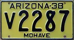 1938 | Embossed black serial on yellow plate with border line; "ARIZONA-38" and county name centered at top and bottom respectively | none | A1234 | Coded by county of issuance (A) | |