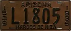 1939 | Embossed black serial on copper plate; "ARIZONA" centered at top; vertical "1539" and "1939" at left and right respectively | "MARCOS DE NIZA" centered at bottom | A12345 | Coded by county of issuance (A) | Commemorated the 400th anniversary of the expedition of Fray Marcos de Niza. |