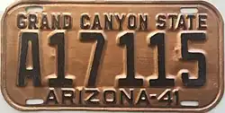 | 1941 | Embossed black serial on copper plate; "ARIZONA-41" centered at bottom | "GRAND CANYON STATE" at top | A12345 | Coded by county of issuance (A) | ||