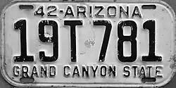 1942–44 | Embossed black serial on white plate; "42-ARIZONA" centered at top | "GRAND CANYON STATE" at bottom | A123 1A234 12A345 |