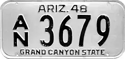 1948 | Embossed black serial on unpainted aluminum plate; "ARIZ. 48" centered at top | "GRAND CANYON STATE" centered at bottom | A/B 1234 | Coded by county of issuance (A/B) | |