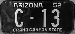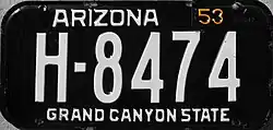 1952–53 | Embossed white serial on black plate; "ARIZONA 52" centered at top | "GRAND CANYON STATE" centered at bottom | A-12345 | Coded by county of issuance (A) | Revalidated for 1953 with black tabs. |