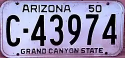 1950–51 | Embossed black serial on white plate; "ARIZONA 50" centered at top | "GRAND CANYON STATE" centered at bottom | A-12345 | Coded by county of issuance (A) | Revalidated for 1951 with aluminum tabs. |