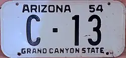 1954–55 | Embossed black serial on white plate; "ARIZONA 54" centered at top | "GRAND CANYON STATE" centered at bottom | A-12345 | Coded by county of issuance (A) | Revalidated for 1955 with aluminum tabs. |