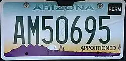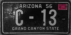 In 1956, the United States, Canada, and Mexico came to an agreement with the American Association of Motor Vehicle Administrators, the Automobile Manufacturers Association, and the National Safety Council that standardized the size for license plates for vehicles (except those for motorcycles) at 6 inches (15 cm) in height by 12 inches (30 cm) in width, with standardized mounting holes.[3] The 1955 (dated 1956) issue was the first Arizona license plate that complied with these standards.