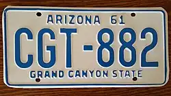 1961–63 | Embossed blue serial on white plate with border line; "ARIZONA 61" centered at top | "GRAND CANYON STATE" centered at bottom | ABC-123 | CAA-001 to approximately DMC-999 | Revalidated for 1962 and 1963 with stickers. |