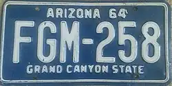 1964–65 | Embossed white serial on blue plate with border line; "ARIZONA 64" centered at top | "GRAND CANYON STATE" centered at bottom | ABC-123 | EAA-001 to approximately FMJ-999 | Revalidated for 1965 with stickers. |
