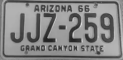 1966–68 | Embossed black serial on reflective white plate with border line; "ARIZONA 66" centered at top | "GRAND CANYON STATE" centered at bottom | ABC-123 | HAA-001 to JZZ-999; NAA-001 to approximately NEF-999 |