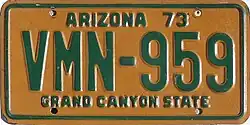 1973–80 | Embossed green serial on reflective pale orange plate with border line; "ARIZONA 73" centered at top | "GRAND CANYON STATE" centered at bottom | ABC-123 | PAA-001 to approximately WNJ-999 | Revalidated with stickers until 1990. |