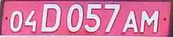 Armenian diplomatic plate - Diplomatic plates are white-on-red, with the format NN L NNN LL. The first group of digits stands for the country code, and a letter D after it signifies a diplomat, while a T indicates a technician. The last two letters are always AM, Armenia's international code, while newer plates get the country code of ARM instead.