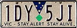 | Victoria | Blue/white | 2Da·naa | VICTORIA – THE EDUCATION STATE | 2DC·1AA | Slogan screened at bottom, No 0 used in 1st or 4th position. All 26 other letters used in all letter positions. |