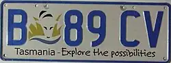 | Tasmania | Blue/white | M nn aa | Tasmania – Explore the possibilities. | M 00 PG | State logo (a thylacine in reeds) screened at left. Slogan screened at bottom. Suffix letters IA-IZ and OA-OZ not used. M is current prefix letter. |
