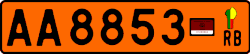 Commercial vehicles have license plates with red symbols on an orange background. Format registration marks are similar to regular. At the right side of the plate are image maps of the country in the colors of the national flag under which the code has RB. Between the main group symbols and code placed rectangular sticker.