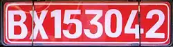 Government vehicles all have the prefix BX, except defence force vehicles which have the prefix BDF. The front BX number plates have red lettering on a white reflective background. The rear BX number plates have white lettering on a red reflective background. The BDF number plates have white letters on a green non-reflective background for the front plate and black letters on a green non-reflective background for the rear plate.