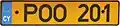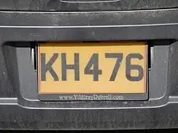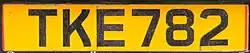 Composed of three letters and three numerals, on yellow plates. White front plates were omitted after 2013.