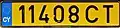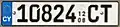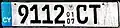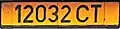 Composed of up to five numerals with the suffix CT, on yellow plates. Since 2013, some numbers have been reissued on white plates.
