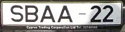 Sovereign Base Areas plates are prefixed SBAA followed by two digits, and have adopted the same new colour and typeface as the Republic of Cyprus.[3]